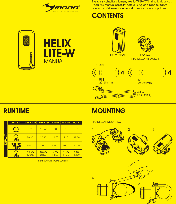 | комплектация | Фонарь Moon Helix Lite 150 Люмен, Крепление RB-37-W, Две резинки разного диаметра, зарядный провод USB - USB-C, Инструкция, Упаковка |