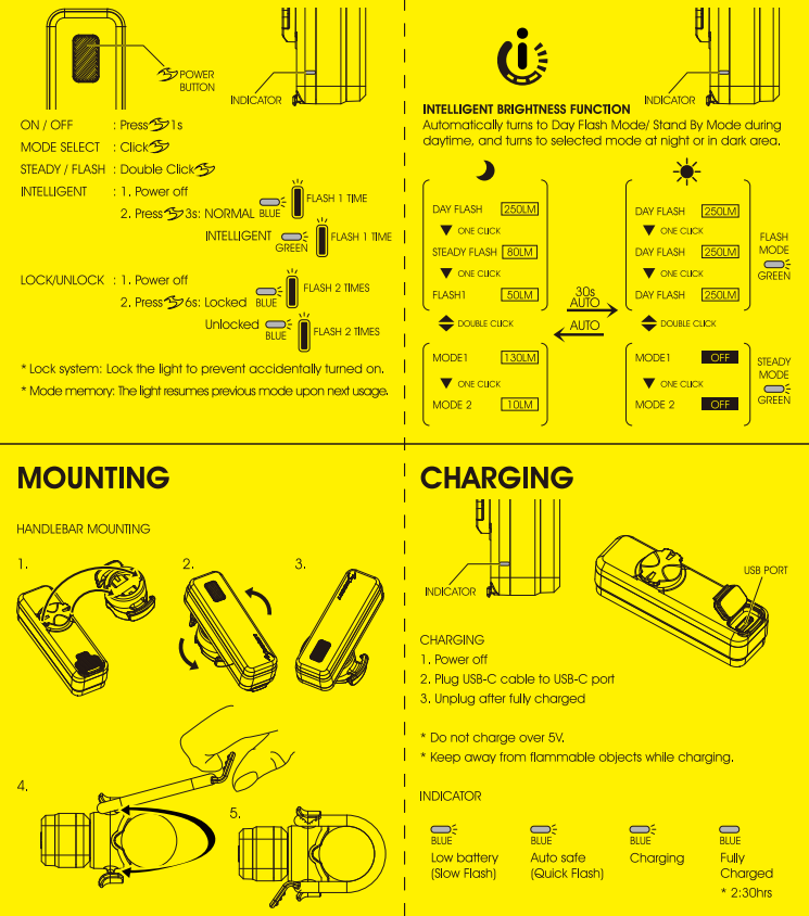 | режимы яркости | 10 режимов: Mode 1 (130 Lum), Mode 2 (10 Lum), Flashing 1 (50 Lum), Steady Flashing (10+80 Lum), Day Flashing (240 Lum), Day Flashing (250 Lum), Steady Flashing (250 Lum), Flashing 1 (250 Lum), Mode 1 (Off), Mode 2 (Off) |