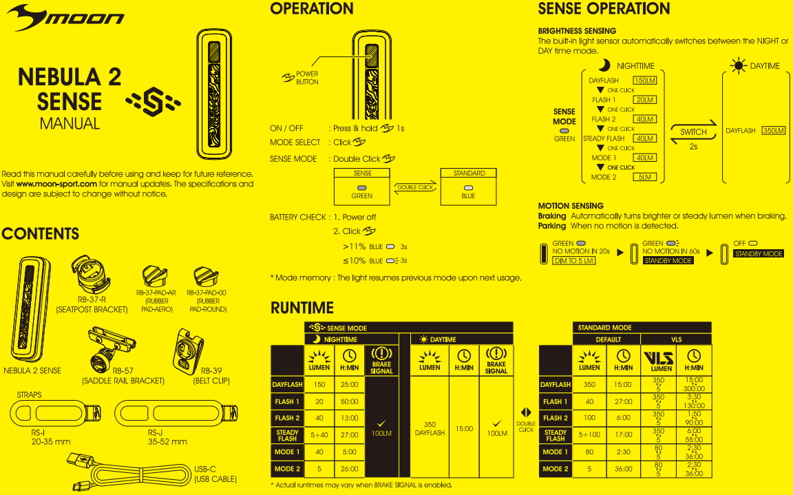 | комплектация | Фонарь Moon Nebula 2 Sense, Быстросъемное крепление RB-22 (установка на любой руль), O-rings для крепления: RS-G (для 20-35mm диаметра); RS-H (для 35-52mm диаметра), инструкция, упаковка |