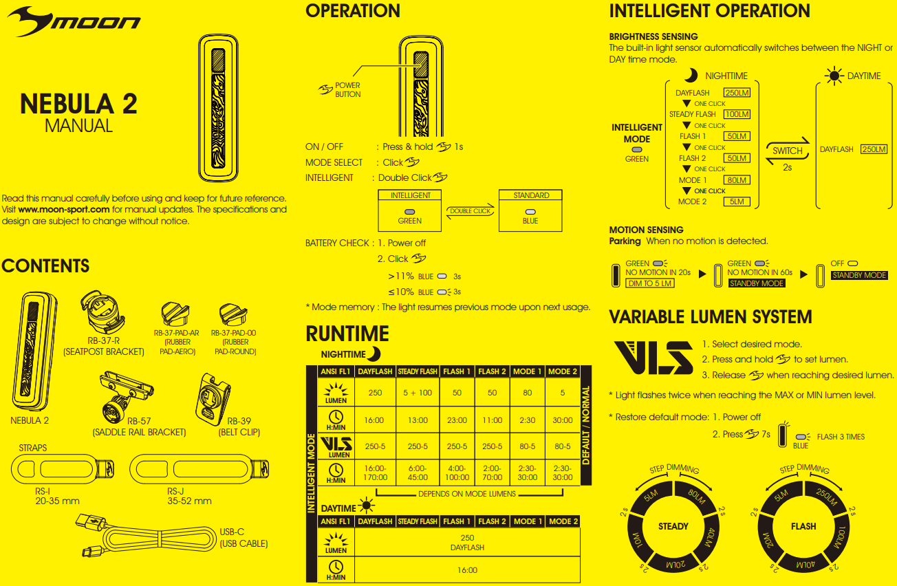 | комплектация | Фонарь Moon Nebula 2, Быстросъемное крепление RB-22 (установка на любой руль), O-rings для крепления: RS-G (для 20-35mm диаметра); RS-H (для 35-52mm диаметра), инструкция, упаковка |