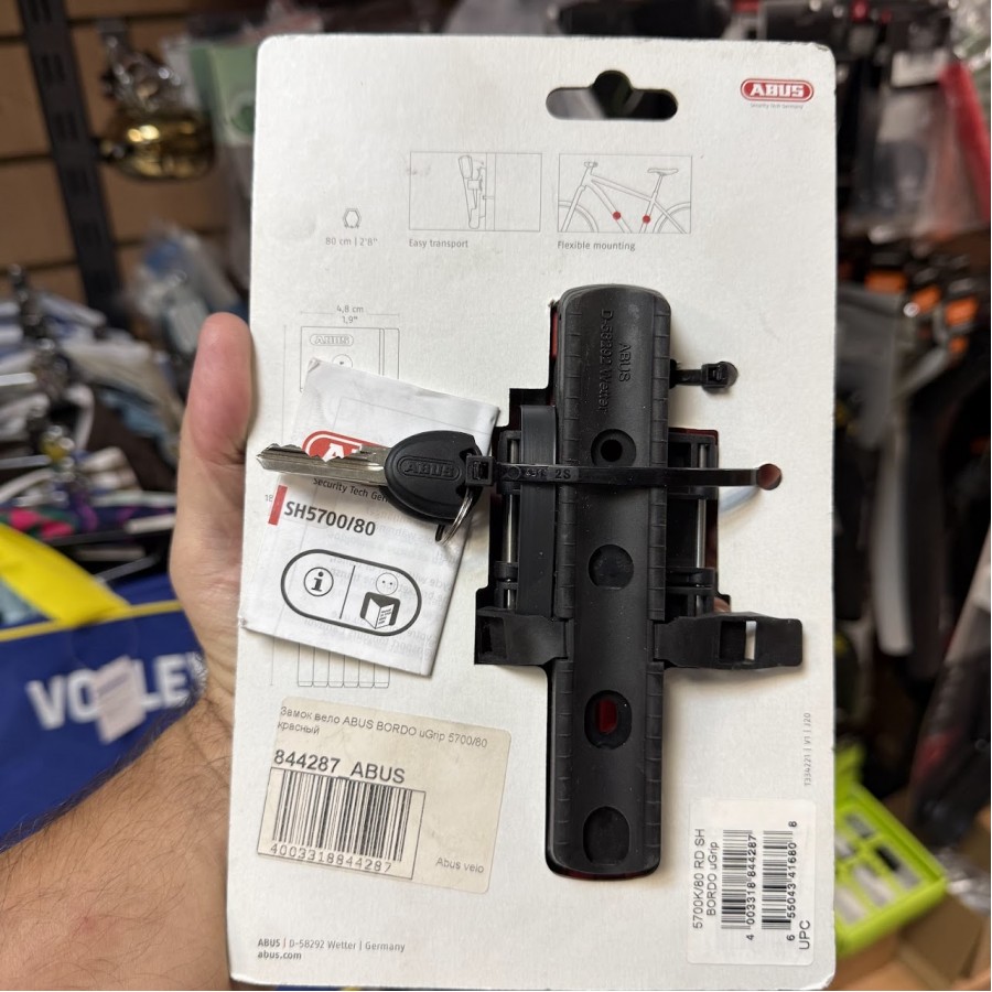 Складной велосипедный замок Abus Bordo uGrip 5700 имеет длину в разложенном виде 80 см. Имеет класс защиты 7 из 20. В комплекте два ключа и крепление под стандартные бонки на раму велосипеда.